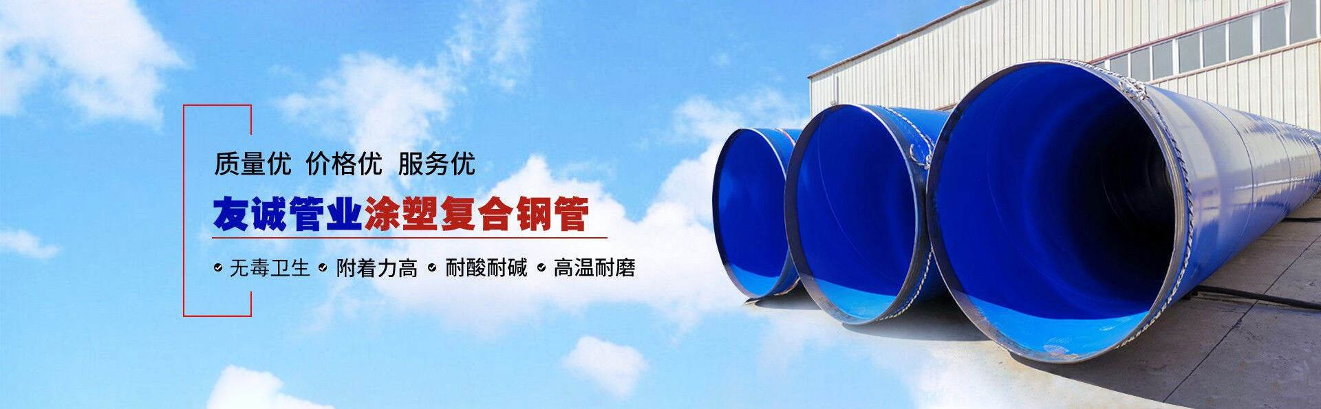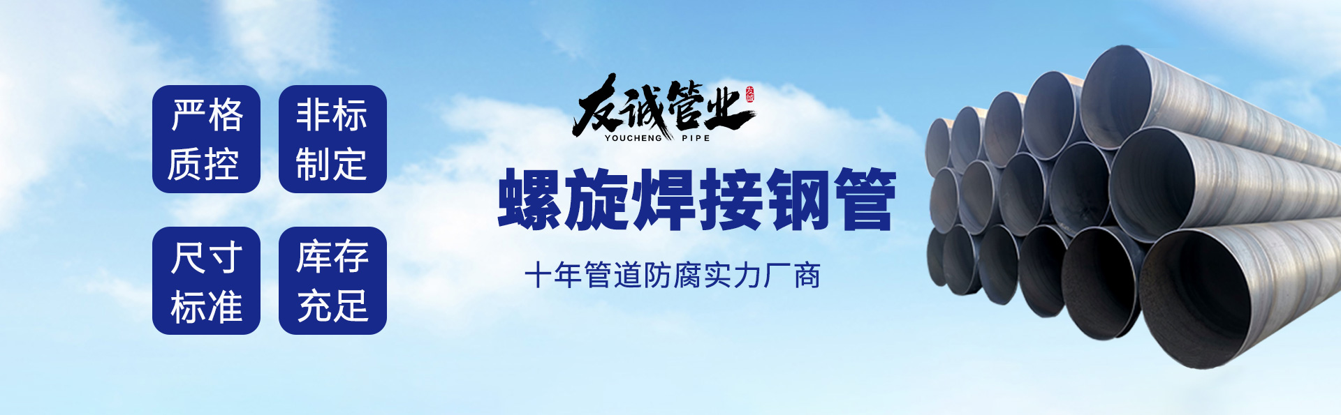 沧州友诚管业有限公司是一家专业从事生产防腐涂塑管道及管件于一体的大型企业。公司注册资金8600万元,位于中国管道生产基地—河北盐山县,近靠京沪高速、荣乌高速、黄石高速30公里,高铁沧州西站40公里,天津国际机场、济南遥墙机场150公里,为客户来访及业务发展提供了便利的交通条件。 钢管系列:螺旋钢管、无缝钢管、ERW直缝焊管、JCOE埋弧焊直缝钢管、热镀锌钢管。 涂塑系列:内外涂塑钢管、涂塑复合钢…… 了解更多